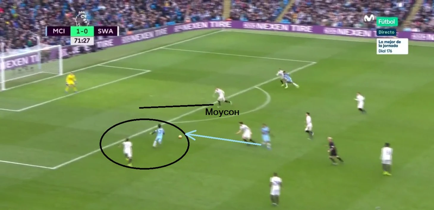 Давид Сильва прорывается с левого фланга, Моусон тут как тут