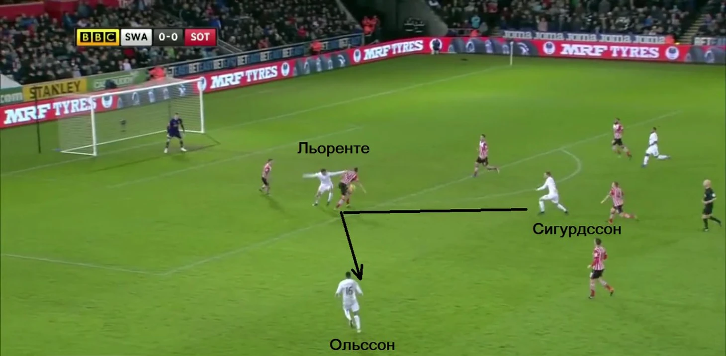 Футболист, способный открыться в свободной зоне и оттуда пробить (обострить) необходим Клементу еще и по другой причине. План Б «Суонси» в атаке – заброс на Фернандо Льоренте и скидка форвардом мяча на инсайдов. Если Раутледж больше придерживается заданной позиции, то Сигурдссон подстраивается под партнера в зависимости от расположения скидывающего игрока и оппонентов. Наличие футболиста такого типажа делает забросы на форварда более эффективными.