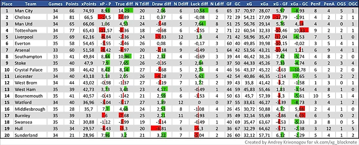 Чемпионы редко обходятся без везения, так уж устроены футбольные лиги. Вопрос всегда в том, насколько сильно везет победителям. Таблица ожидаемых очков (ниже), основанная на системе подсчета качества создаваемых моментов каждой из команд, показывает, что «Челси» идет на одном уровне с «МЮ» и «Тоттенхэмом», чуть опережая «Ливерпуль» и ощутимо отставая от «Манчестер Сити». Тем не менее, «Сити» вынужден бороться за попадание в зону Лиги чемпионов, а «Челси» уже гарантировал себе чемпионский титул. «Синие», к примеру, ни разу не переиграли «Ман Сити» по качеству моментов, но при этом дважды победили.