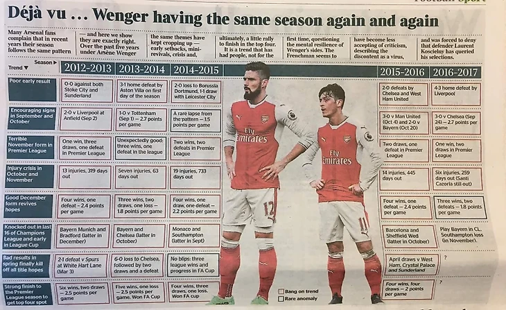 У Гардиан есть картиночка, показывающая, как играет «Арсенал» последние пять сезонов. Я уже даже не знаю, плакать или смеяться, глядя на нее (ниже).