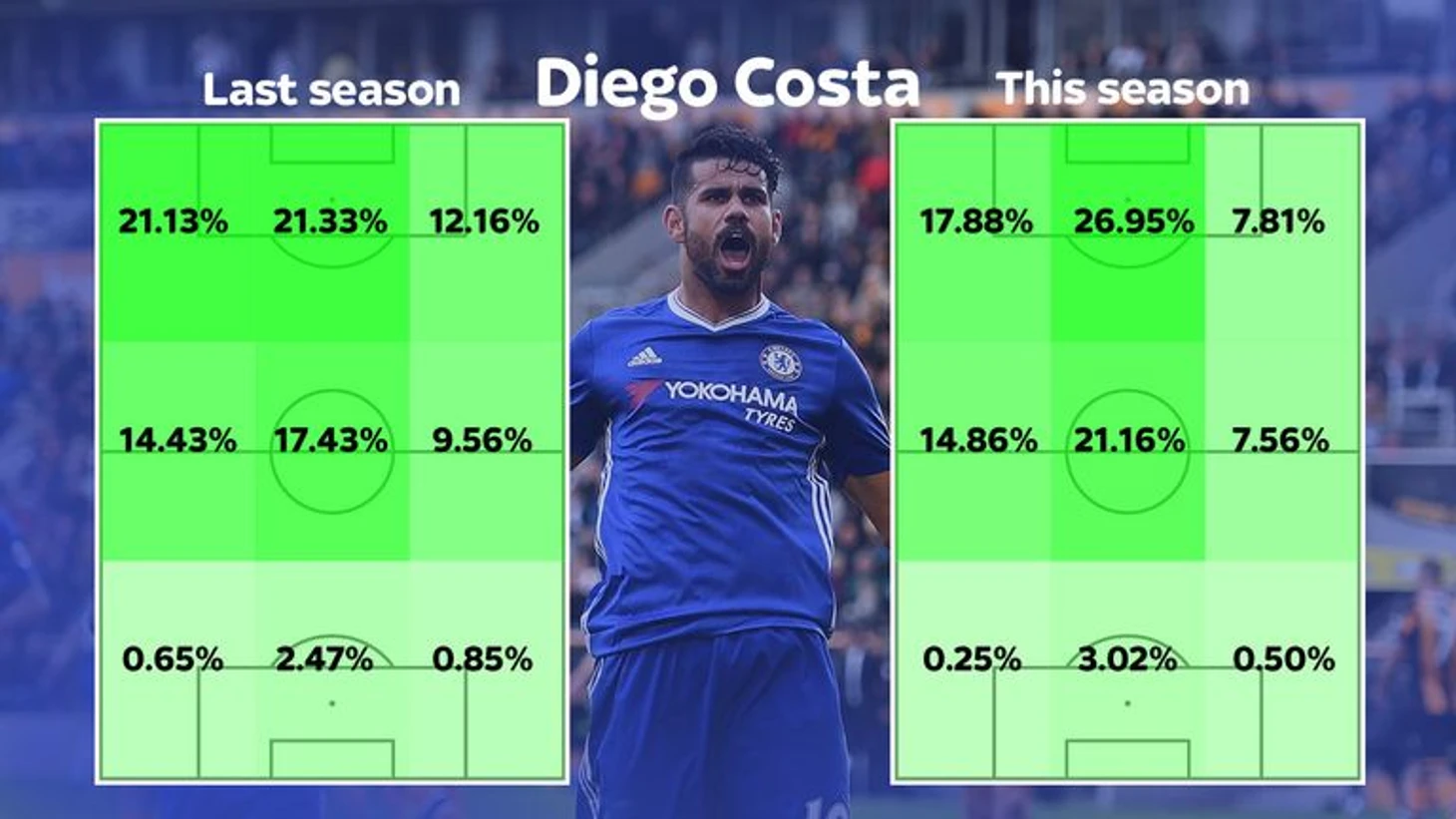 Карта активности Косты подчеркивает, что относительно себя прежнего он стал дисциплинированнее держать позицию в рамках роли, которую требует Конте, но Диего все равно слишком часто покидал позицию. В недавнем интервью Конте, не называя фамилий, намекнул на проблему: «Если ты хочешь, чтобы у команды появился стиль, все игроки должны соблюдать идею тренера. В противном случае все усложняется. Если тренер просит игрока держать позицию, а он бродит по полю, то практически невозможно играть в нужном стиле. Тренер начинает беситься… такое бывает».