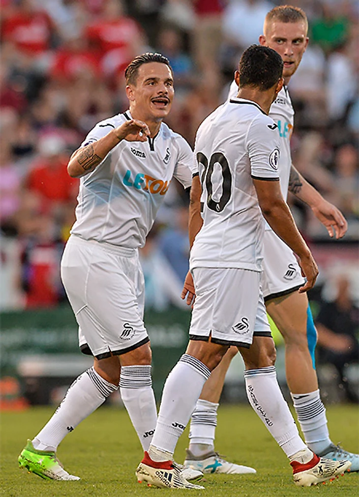 Это шоу Роке на посвящении в команду. Так он прощался с «Лас-Пальмасом». Вот так он поздравляет партнеров с голами (мое любимое!). Рэндомное фото в соцсети – и он все равно указывает всем, как располагаться (настолько все видит, что всегда это делает). «Суонси» уже успешно использует созвучность его имени с Рокки. Все это уместилось в пару летних месяцев. В общем, он офигенный, а матчи «Суонси» для меня теперь просто Mesa-watch.