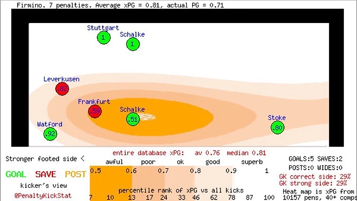 Второй гол хозяев получился во многом случайным, но надо отдать должное Салаху: египтянин отборолся до конца, восстановил владение и нанес удар. Под конец первого тайма хозяева могли решить все вопросы: Морено занял очень высокую позицию при выходе из обороны, после длинной передачи выиграл верх и скинул на ход Мане, а тот попал в руку Парехо, но продолжил борьбу. Нико, кажется, решил во что бы то ни стало привезти пенальти и ухватил сенегальца за майку, в итоге повалив – рефери указал на точку. В отсутствие Милнера и Коутиньо встал вопрос, кому же стоит пробить пенальти, и вышел Фирмино. Решение, на самом деле, спорное: Фирмино реализовал 5 из 7 ударов с одиннадцатиметровой отметки до этого, но у остальных ситуация была еще хуже. Ниже – картинка из твиттера @PenaltyKickStat, наглядно показывающая все пенальти девятки «Ливерпуля» (и вероятность, что удар в данную точку станет голом, на основании более десяти тысяч пенальти).