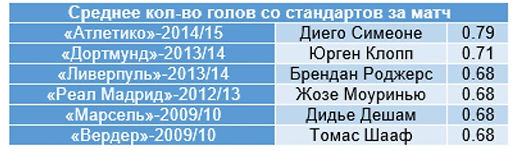 Лучшие показатели по голам со стандартов в топ-лигах с 2009-го