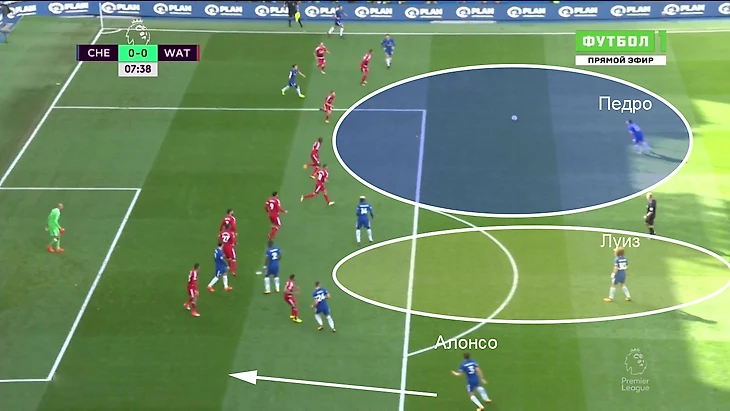 Оставалось только придумать, как использовать эту слабость. План Конте получился максимально эффективным. Тренер использовал то, что «Уотфорд» при стандартах не опекает игроков на границе штрафной. При угловых там оставались Педро, Луиз и Маркос Алонсо: