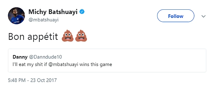 Но даже если так... Не делайте резких движений, как этот парень, пообещавший съесть собственное дерьмо, если Батшуайи принесет победу в матче: