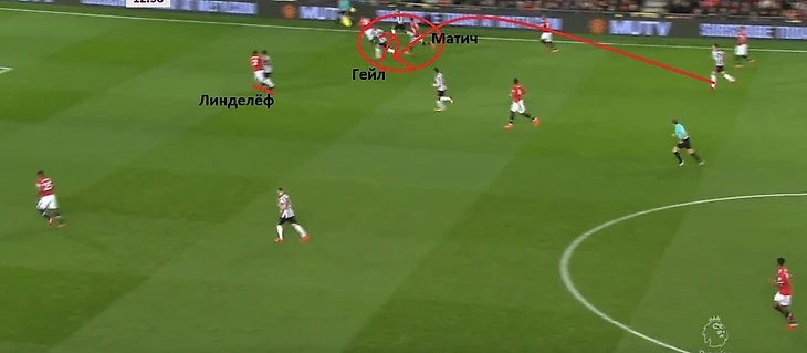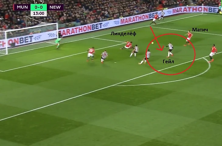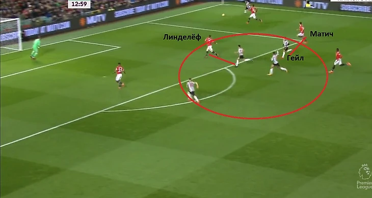 4 игрока «Ньюкасла» около штрафной. Из всех игроков «Юнайтед» только Линделеф еще хоть как-то контролирует своего игрока. Матич с Гейлом разминулись.
