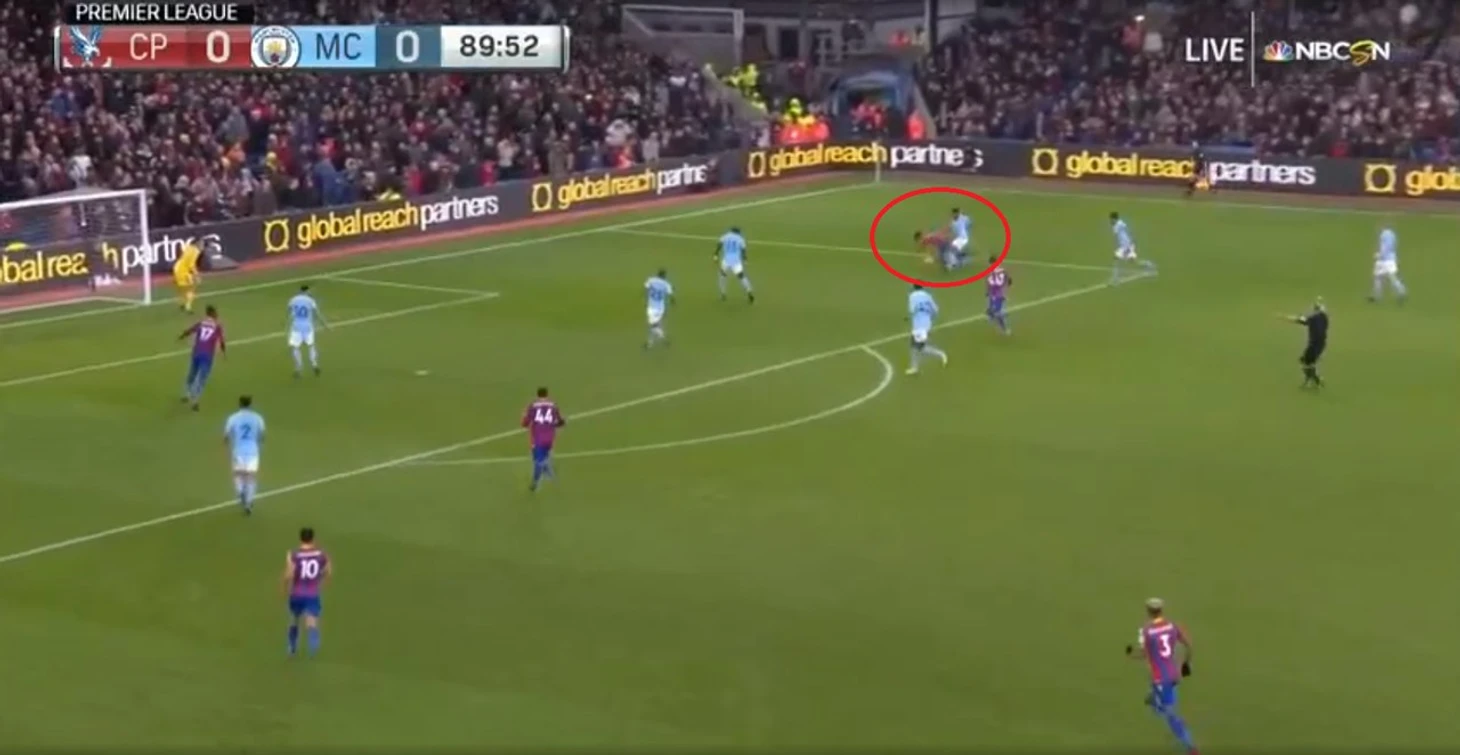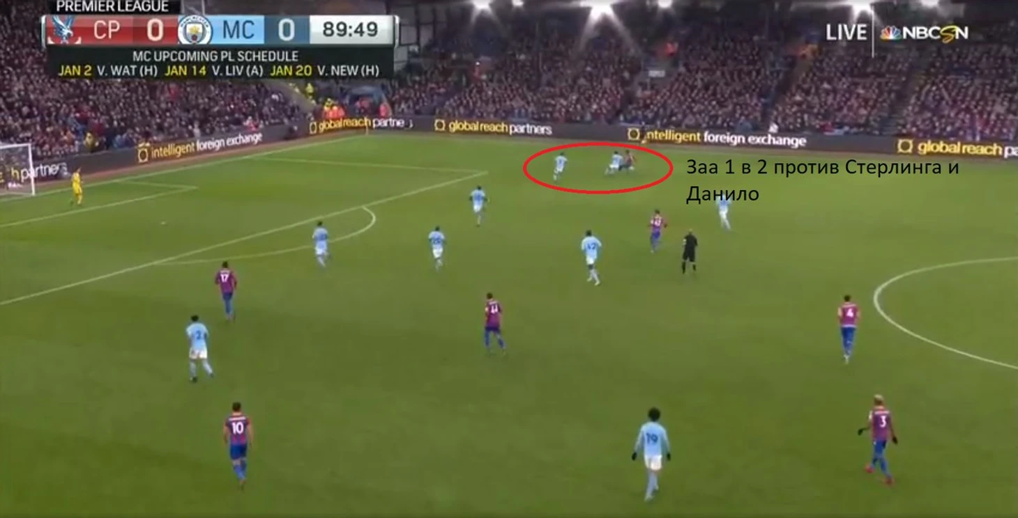 Хеннесси выносит мяч с последней трети поля на Заха. Уилфрид принимает мяч в окружении Данило и Стерлинга. Секунду спустя ивуариец оставил в дураках обоих, протащил мяч до штрафной и рухнул под давлением не успевшего Стерлинга. Ставь пенальти, не имеешь права! Советую посмотреть этот финт в повторе, кстати.