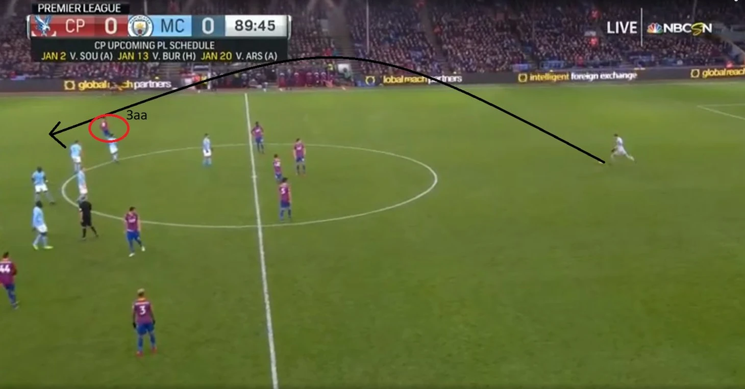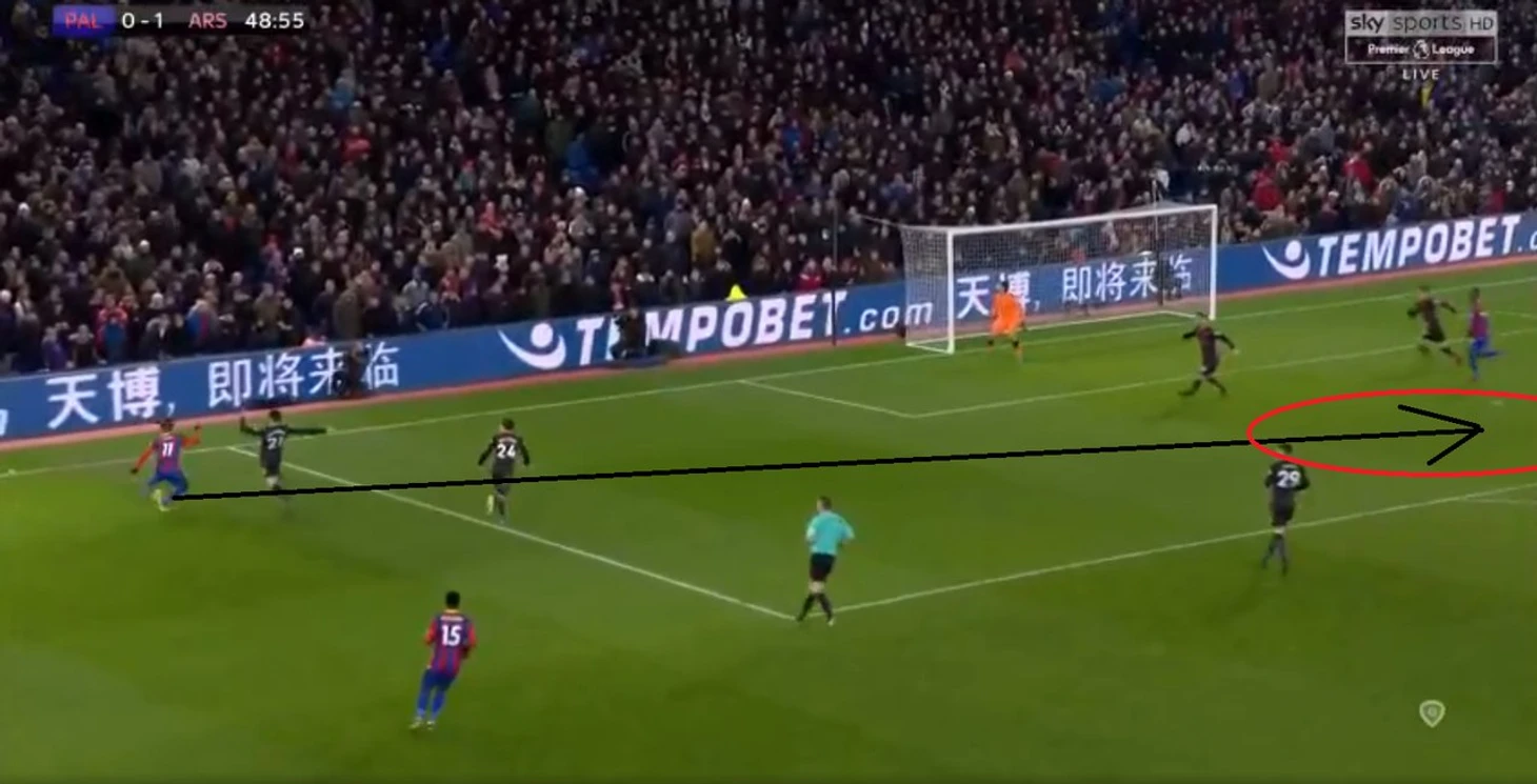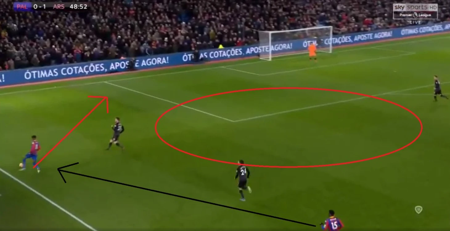 Заха открылся на левом фланге и получил мяч. Благодаря тому, что центральный защитник «Арсенала» Чемберс выдернулся на Уилфрида, в защите «Арсенала» зияла довольно крупная свободная зона. Если бы команда Заха атаковала большими силами, кто-то мог бы ворваться. Тем не менее, вариантов у Заха не было, и ему пришлось обыграть Чемберса, а затем прострелить в штрафную, где передачу замкнул Таунсенд.