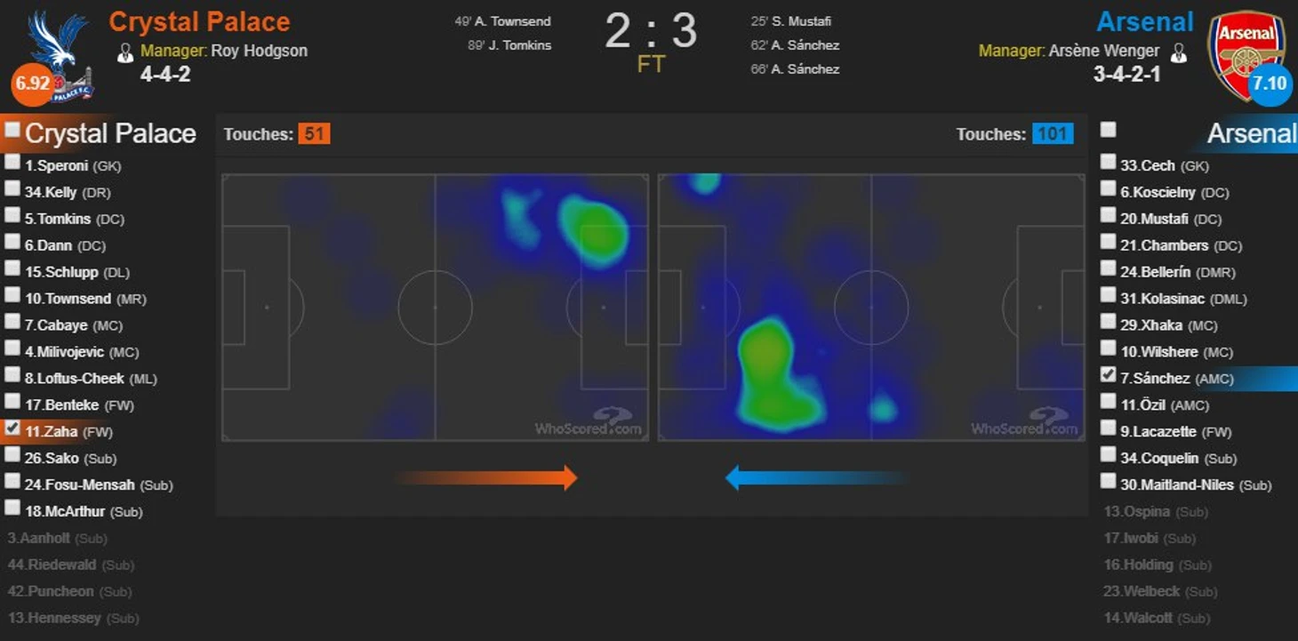 Может играть на нужной позиции. Арсен Венгер в «Арсенале» использует схему 3-4-2-1 с двумя инсайдами. Один из инсайдов, Алексис Санчес, который вот-вот должен покинуть клуб, действует ближе к штрафной, чем Озил, и при этом может смещаться на фланги для растягивания обороны соперника. Уилфрид в «Кристал Пэлас» хоть и играет номинально второго нападающего в паре с Бентеке, но по движению и функциям на поле сильно напоминает чилийца. Взгляните на тепловые карты.