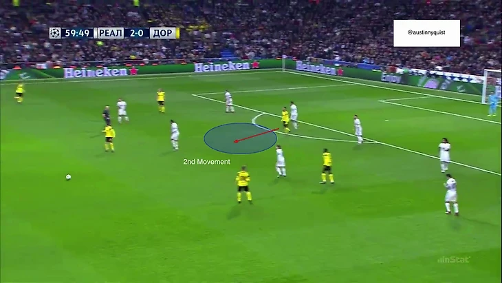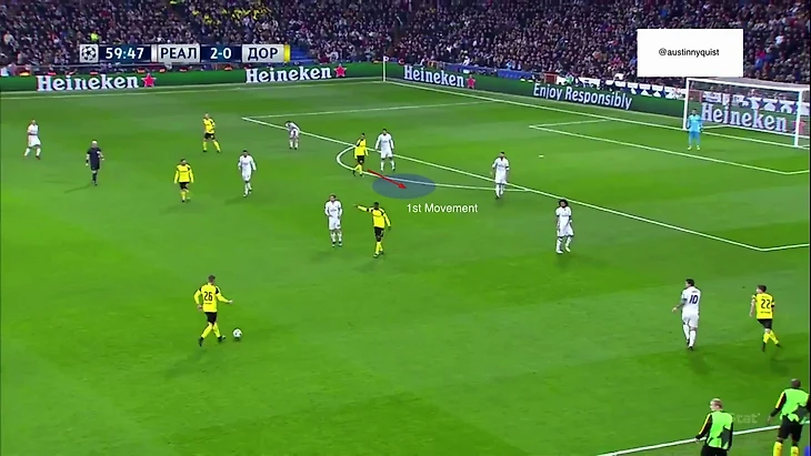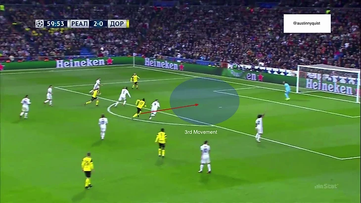 В финальной стадии он просто обгоняет Рамоса и переправляет мяч в ворота, но лишь умное движение привело его в сценарий с забегом против Серхио. Он сделал минимум два осмысленных и эффективных рывка (ложный за спину и обратный в опорную).