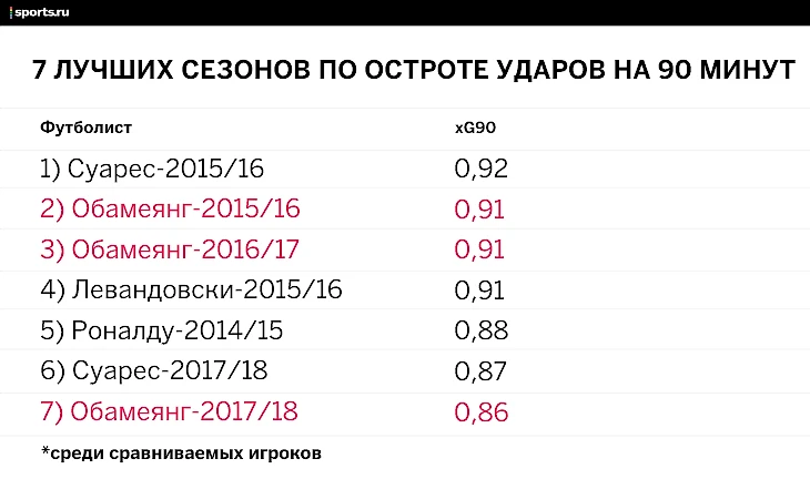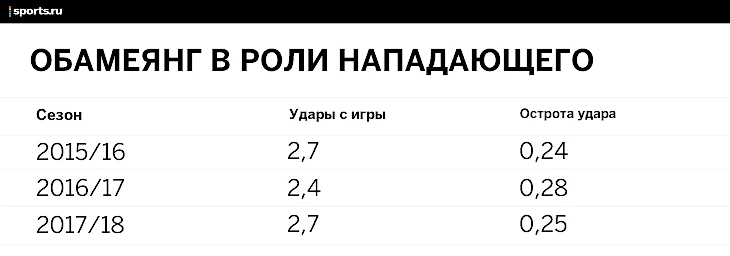 Главный плюс Обамеянга – у него всегда очень много моментов. Прямо столько, что нельзя просто списать на атакующий стиль команды и скорость с открываниями. Это нечто большее – по соотношению количества и качества моментов он уделывает лучших в мире.