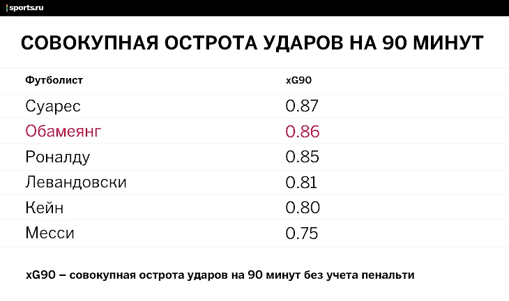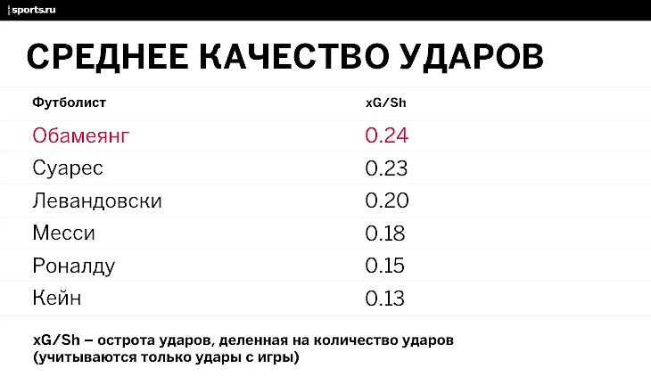 Левандовски, Суарес и Кейн – топ-нападающие, с которыми можно сравнивать Обамеянга. Месси и Роналду в сравнении, потому что это Месси и Роналду. Идеально было бы сравнить вообще со всеми форвардами топ-лиг, но данные компилировались вручную, поэтому ограничился этими игроками (пожалуйста, давайте без вопросов «а почему не Игуаин/Кавани/кто-то другой?» – по этим показателям в любом сравнении Обамеянг выглядит выгодно, нет смысла перебирать игроков).