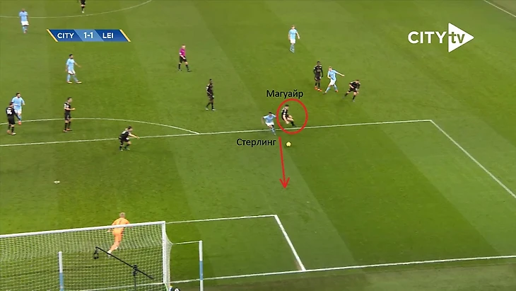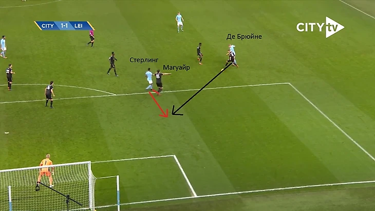 Резкий рывок Стерлинга после неожиданного паса между ног Олбрайтону от Де Брюйне. Магуайр банально не успел развернуть корпус.