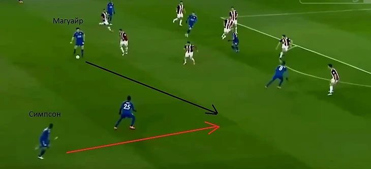 Начав продвижение от бровки из центральной зоны, Харри пролетает мимо одного соперника, добегает до финальный трети и выдает пас из левого полуфланга на свободное пространство, куда мчится Симпсон.