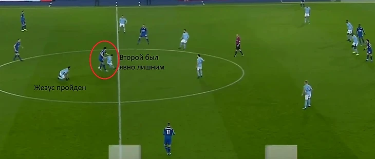 Магуайр уже повалил Жезуса на газон (читай – обыграл), но зачем-то пошел дальше – Диас в подкате отобрал мяч. Повезло, что сработала подстраховка.