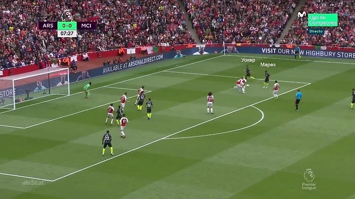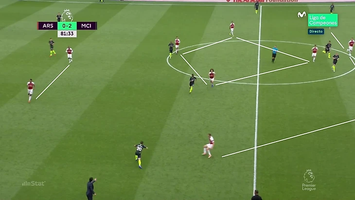 На другом фланге созидал Марез. У него другая манера – смещаться для удара или обострения, а не набирать скорость или обыгрывать 1-в-1 (хотя при необходимости может). Ему нужно пространство, поэтому на этом фланге создавалась ситуация 2-в-1, где партнеры Мареза отвлекали левого защитника «Арсенала». По возможности это делал Уокер. Когда Кайл был слишком занят в первой стадии розыгрыша мяча, задачу выполнял Бернарду Силва.