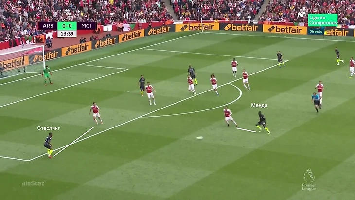 На краях у «Сити» были инвертированные вингеры Рахим Стерлинг и Рияд Марез – это уже отличие от прошлогоднего плана. Оба сохраняли широкую позицию против крайних защитников «Арсенала». Но их вскрывали по-разному.