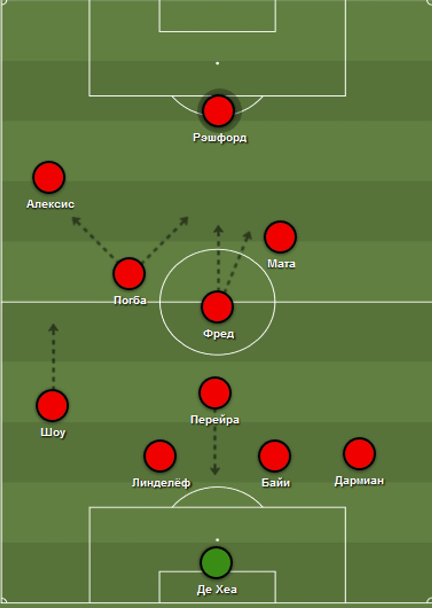 Цепкая и одновременно креативная манера игры Перейры в опорной зоне освободила Фреда и Погба, которые смещались то влево, то ближе к штрафной «Лестера». Они часто поддерживали Шоу с Санчесом, перегружая левый край и помогая создавать численное преимущество на маленьком пространстве, несмотря на активный прессинг «Лестера».