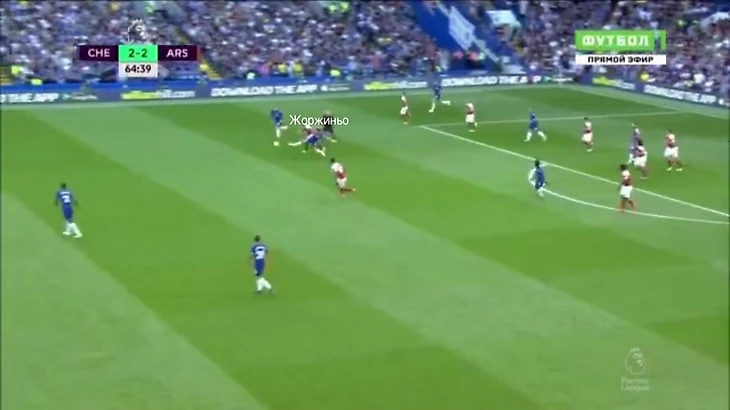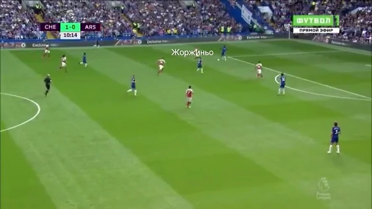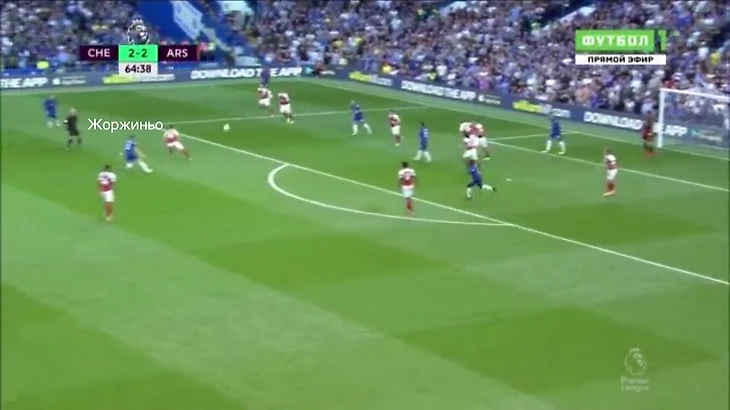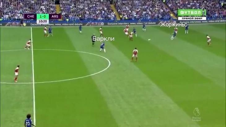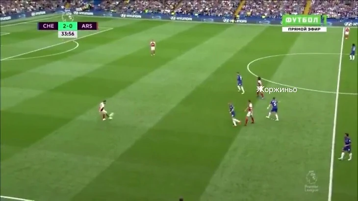 Вот одна из атак «Челси» в матче с «Арсеналом» защитник выносит мяч головой. Мы видим, где в этот момент располагается Жоржиньо: