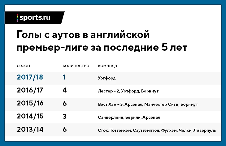 P. S. Ребята с InStat указали еще один гол с аута, который был забит в прошлом сезоне, но не попал в таблицу – мяч Тэмми Абрахама («Суонси) в ворота «Уотфорда» в сентябрьском матче. Спасибо!