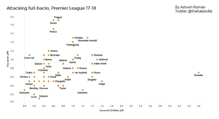 Кто такой Масуаку? Левый защитник «Вест Хэма». Француз (примерно такой же, как Траоре испанец). И просто хороший человек: в январском матче он смачно харкнул в игрока «Уигана» Ника Пауэлла. Но известен Артюр благодаря дриблингу – пятый результат по попыткам обводок в прошлом сезоне АПЛ. В твиттере он получил популярность благодаря этому графику: