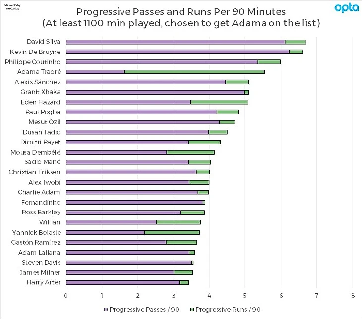 Впрочем, по ходу сезона мозг Траоре начал насыщаться кислородом – четыре progressive runs/90 (рывки с мячом, продвигающие владение команды к чужим воротам на 10-15 ярдов: 1 pr со своей половины поля – это 15 ярдов, 1 pr на чужой трети поля – 10 ярдов ) и 1,5 progressive passes (пасы, продвигающие владение команды к чужим воротам на 10-15 ярдов, с подсчётом все аналогично pr) – это как бы ни разу не ерунда, можно посмотреть, в какой приятной компании оказался игрок по этому показателю:
