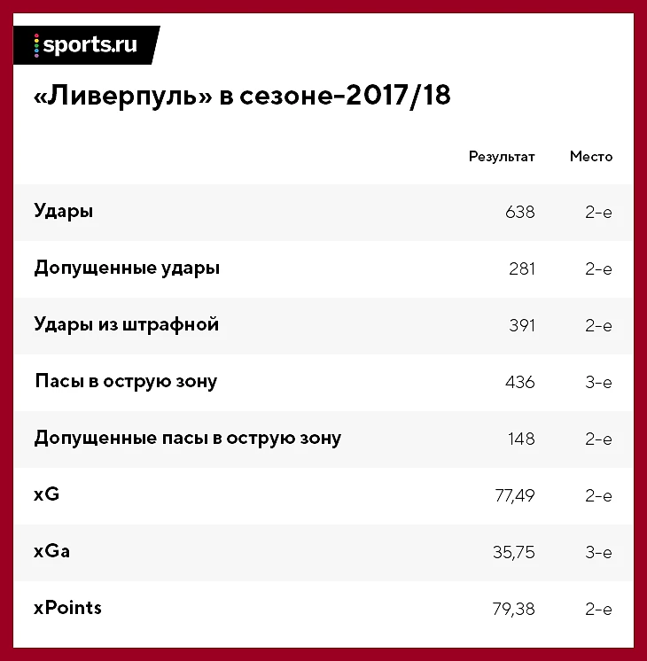 Ни в одном ключевом показателе качества игры «Ливерпуль» не опускается ниже 3-го места. Даже критикуемая защита была надежнее, чем у «МЮ», «Тоттенхэма» и «Арсенала». В совокупности эти цифры дают команде Клоппа уверенный статус 2-й по качеству футбола команды прошлого сезона.