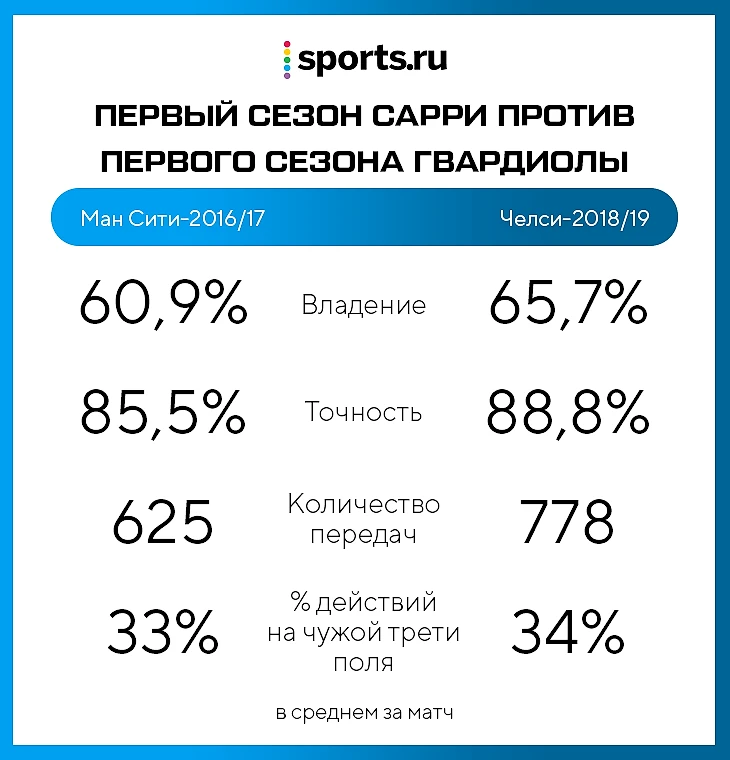 Первый сезон Пепа Гвардиолы в «Манчестер Сити» – хороший контекст для того, что сейчас происходит в «Челси». Испанец подхватил даже более атакующую команду, чем Сарри, но не вывел важные для испанского стиля цифры на космический уровень сразу. У него не было контролирующего опорника. В эту роль переучили Фернандиньо: он быстро учился, но не обладал описанным выше даром Бускетса или Жоржиньо. Результат: на внедрение стиля ушло больше времени.