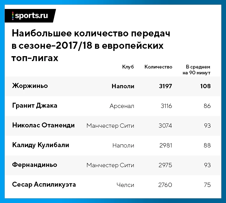 Форма такого футболиста сильно зависит от системы, которая его окружает. Другой явно топовый представитель роли – Серджи Бускетс – сейчас не окружен системой, которая на 100% открывала бы его таланты. Бускетс остается гением, но прямо сейчас Жоржиньо кажется даже мощнее его (в первую очередь за счет стиля Сарри). То есть в своей роли Жоржиньо – лучший в мире. Косвенно это подтверждают цифры его передач.