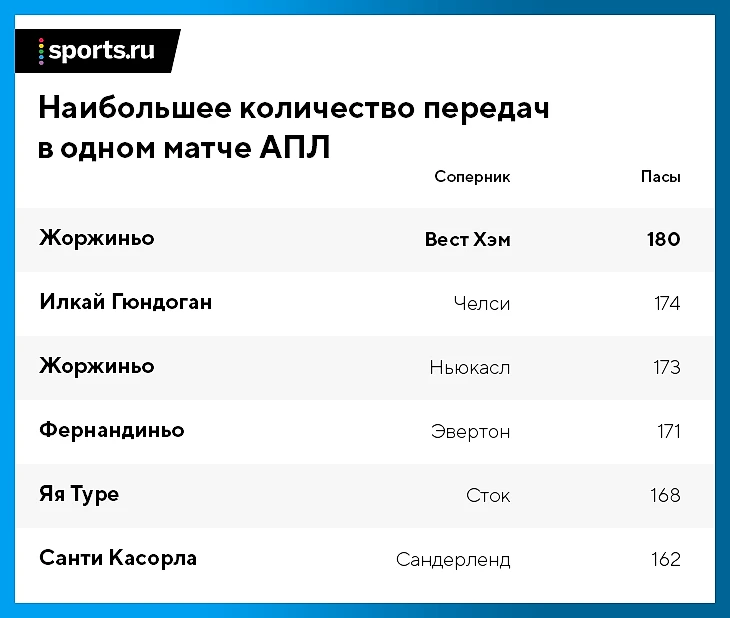 В матче против «Вест Хэма» Жоржиньо отдал 180 передач. Это невероятное достижение, которое отлично подчеркивает его крутость.