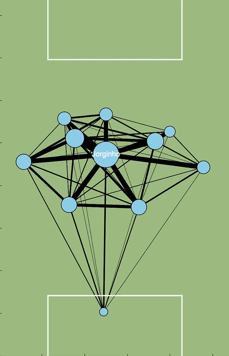 Жоржиньо идеально разбивает первую линию обороны соперника пасами через центр. Причем он может делать это и прямо (передачей), и косвенно (умным движением), что помогает команде продвигаться. Схематически последнее выглядит примерно так: