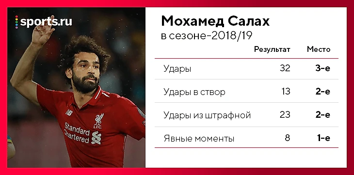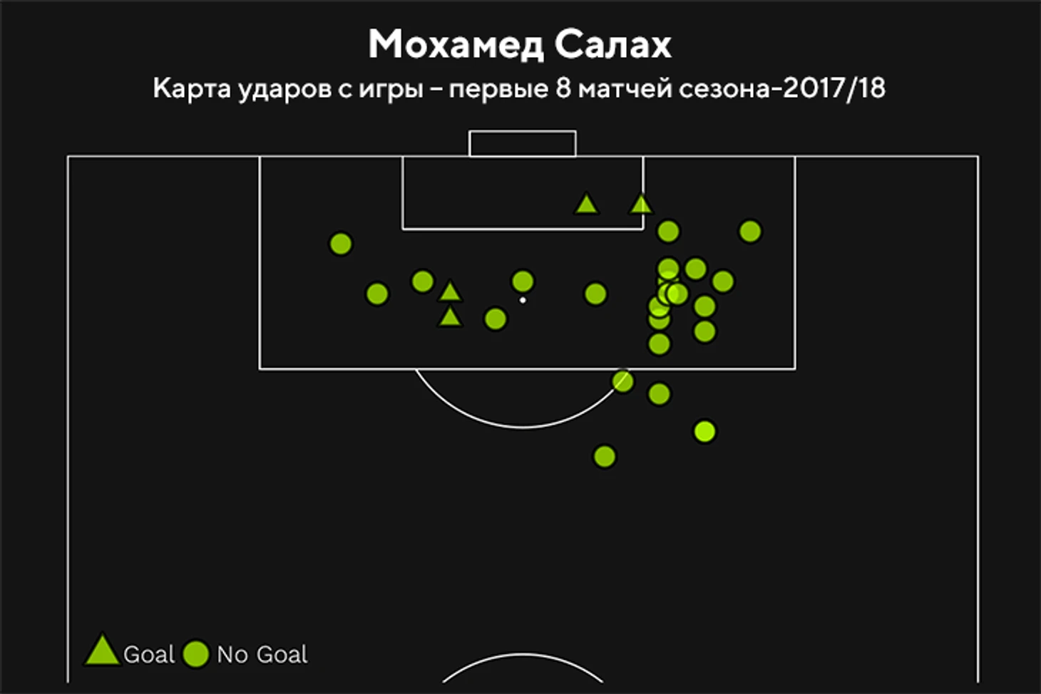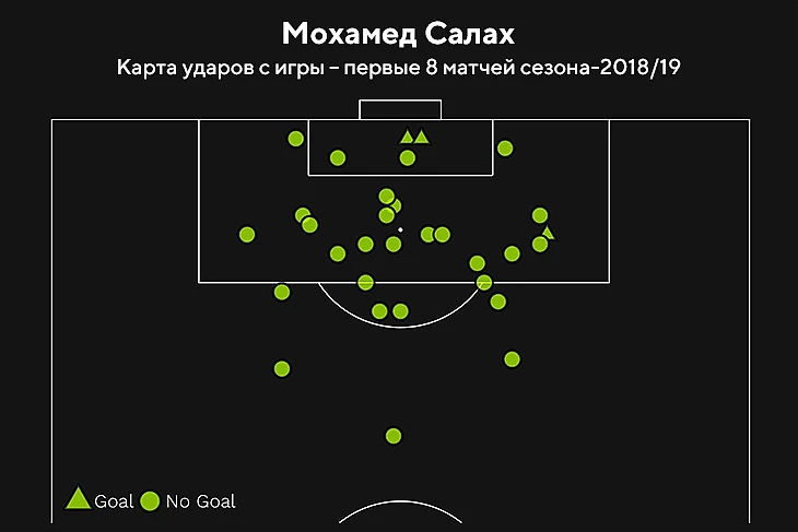 Еще один важный фактор – изменение характера ударов Салаха. Это карта атакующего правого вингера, который часто оказывается в убойных позициях в штрафной: