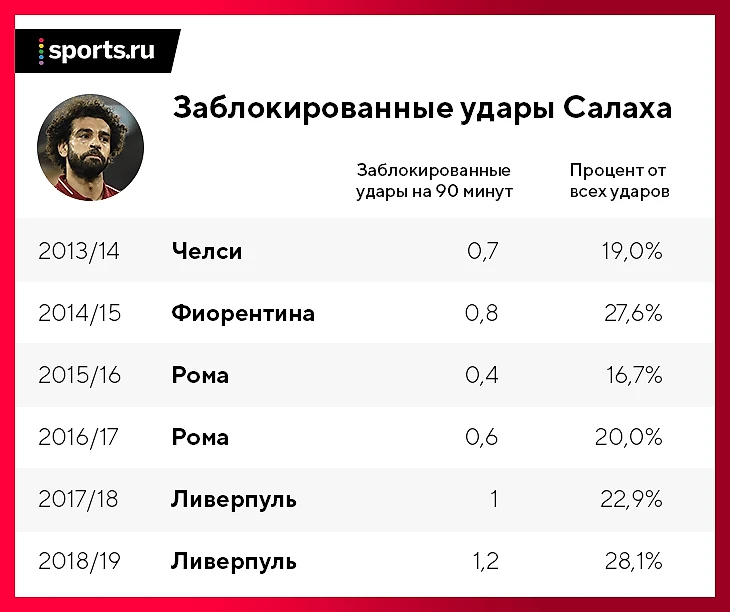 Косвенно возросшее давление на Салаха прослеживается через статистику заблокированных ударов. Так часто его удары не блокировали еще никогда.