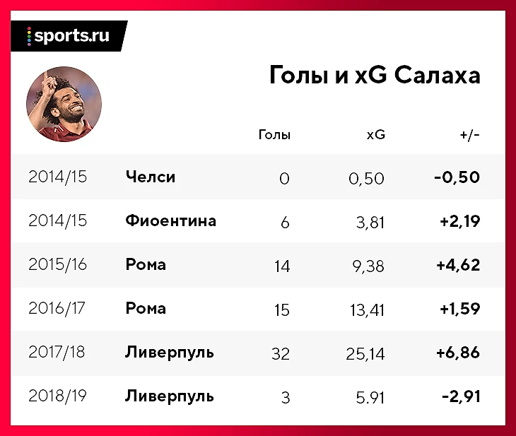Единственный случай (до этого сезона), когда Салах «провалился» относительно xG, связан именно с малой выборкой. В том случае он сыграл лишь три неполных матча за «Челси». На дистанции Салах всегда показывал себя хорошим завершителем атак.