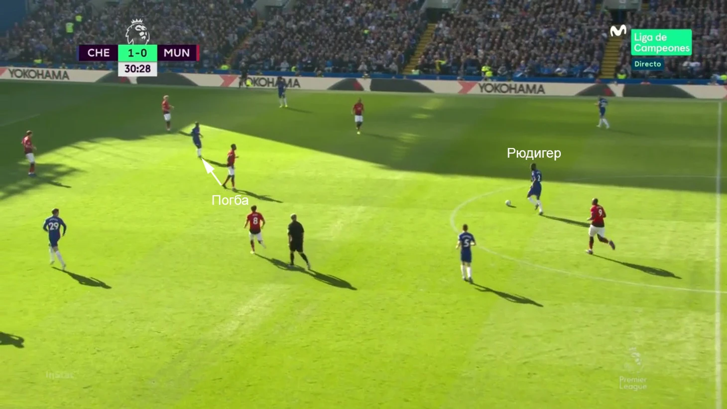 Центральные защитники регулярно получали свободу для продвижения с мячом. Погба не выдвигается на Рюдигера из-за персональной работы по Канте. Антонио отдаст в штрафную на подключающегося Алонсо.