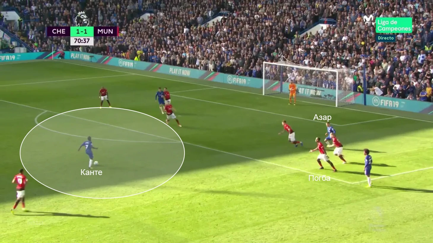 В этом моменте установка передать Азара путается с установкой играть персонально. Погба побежал помогать против Азара. Канте получил свободу перед штрафной.