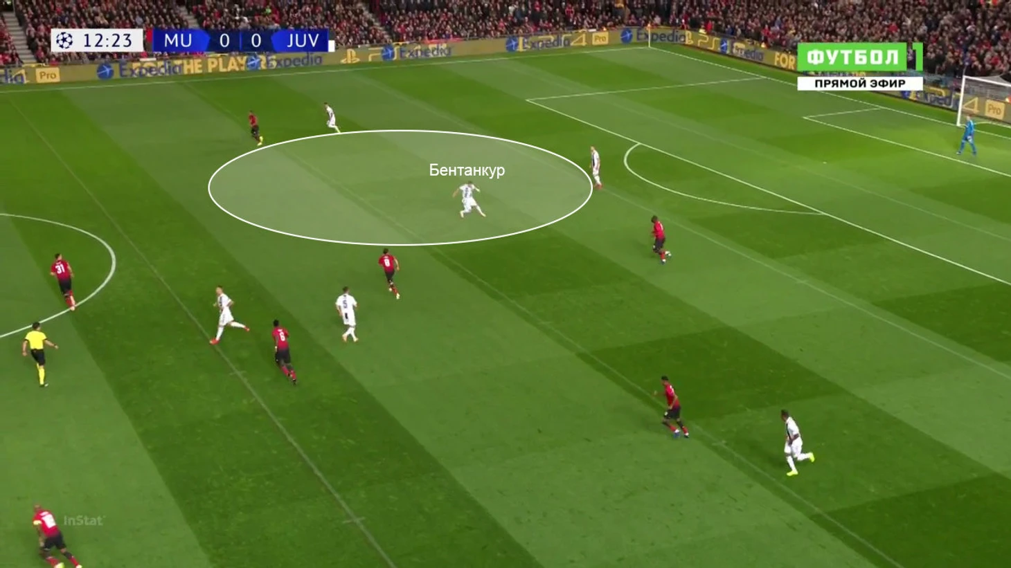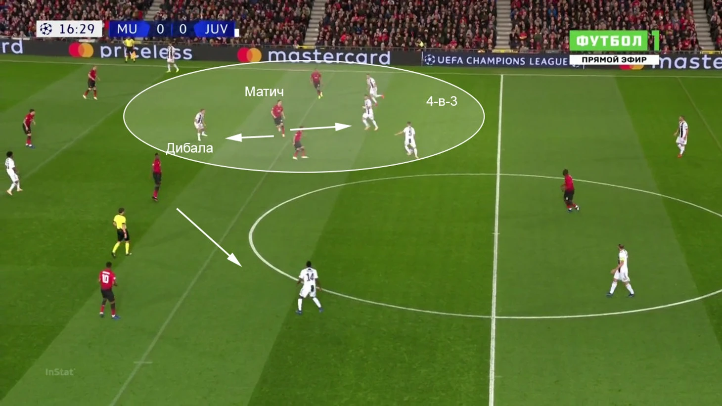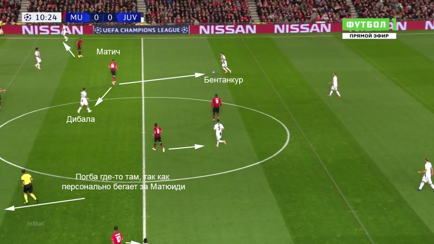 Ситуация перед голом «Ювентуса». «МЮ» строит игру персонально – Погба оглядывается на оппонента по схеме Блеза Матюиди. Хотя нужно было адаптироваться: ближе к Матюиди все равно находился Рэшфорд, а Дибала – более опасный вариант и уже был за спиной у Матича, у которого есть и другой игрок – Родриго Бентанкур. Результат – в ситуация 4-в-3, которую «Юве» отлично разыграет.