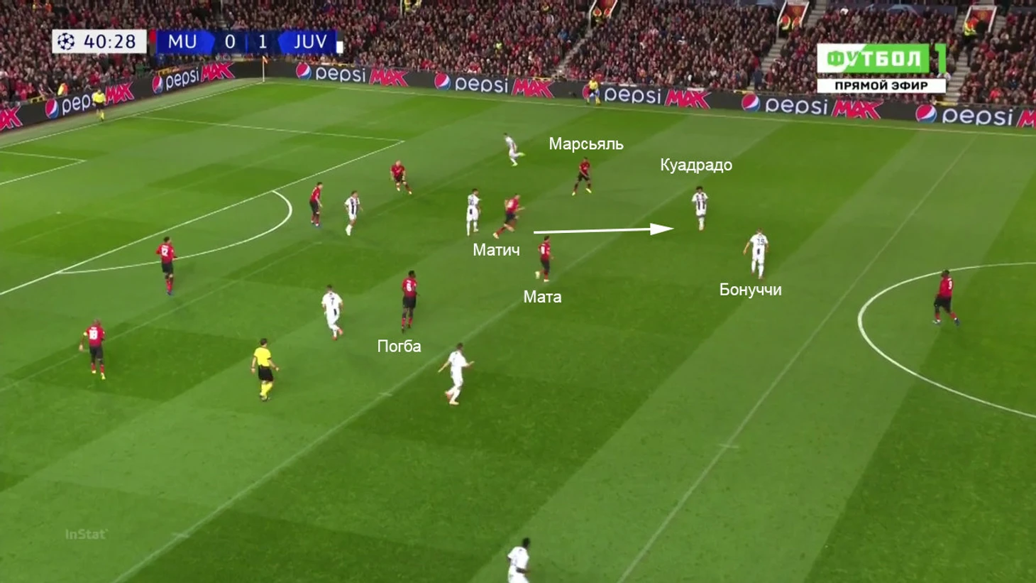 У «Юве» снова преимущество: Матич выдвигается на Куадрадо, чтобы немного уравнять шансы, но все вокруг него – ужасно. Мата двигается в сторону Бонуччи, но медленно, пассивно и неэффективно. Марсьяль мог либо выдвинуться на Куадрадо раньше Матича, либо следить за рывком Жоау Канселу, но решил не делать ничего. Погба никак не реагирует на движение Матича, хотя в идеале должен контролировать пас в опорную/подбор.