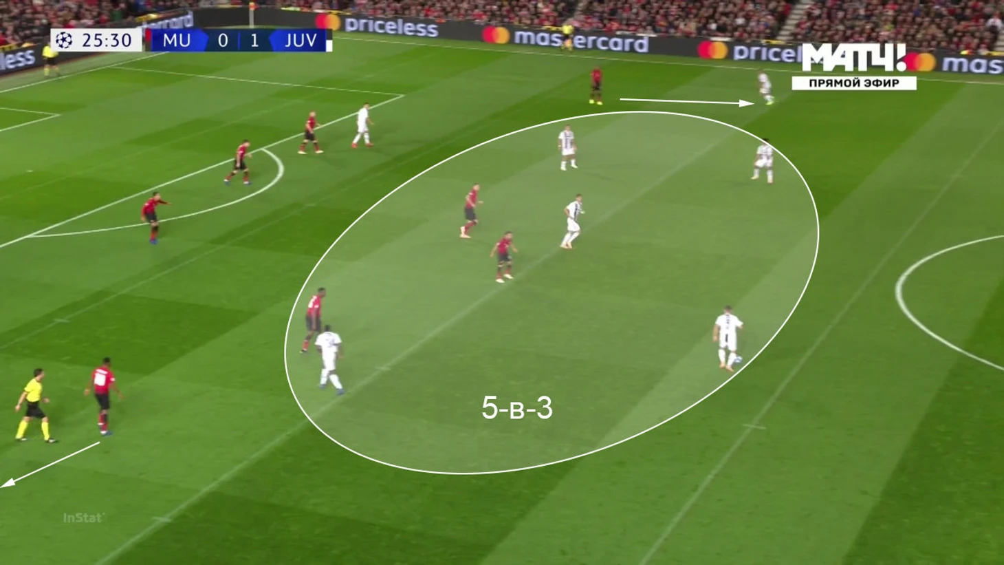 Из-за нехватки компактности у «МЮ» и слаженности перемещений у «Юве» в центре поля возникла ситуация 5-в-3. Это радикальный случай, но команда Аллегри регулярно создавала и элегантно разыгрывала преимущества.