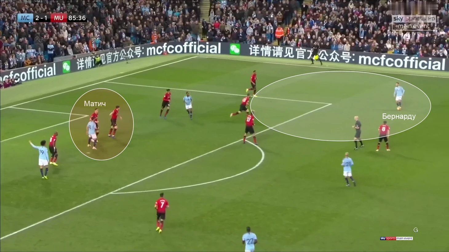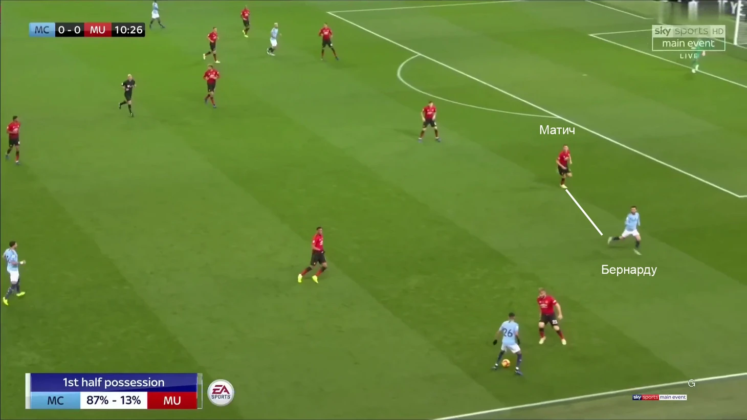 Бернарду Силва с мячом, на него никто не оказывает давления – обычно это служит индикатором для того, чтобы защитники приготовились разобрать соперников и бежать за ними до конца после потенциального паса. Виктор Линделеф специально указывает Матичу на Илкая Гюндогана. Сам Матич на него даже оглядывается, но в решающий момент просто забивает на рывок.