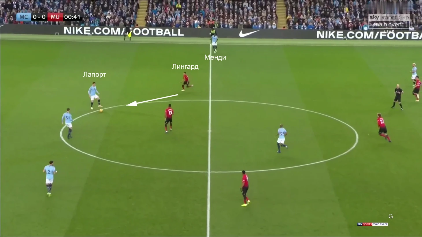 Замысел работал недолго. Постепенно футболисты «Сити» адаптировались – Менди изначально занимал более высокую позицию (следовательно, был далеко от Лапорта), Лингард не мог разрываться. В такой ситуации Джесси выбирал игру с Менди. «Сити» легко выводил мяч в полузащиту.