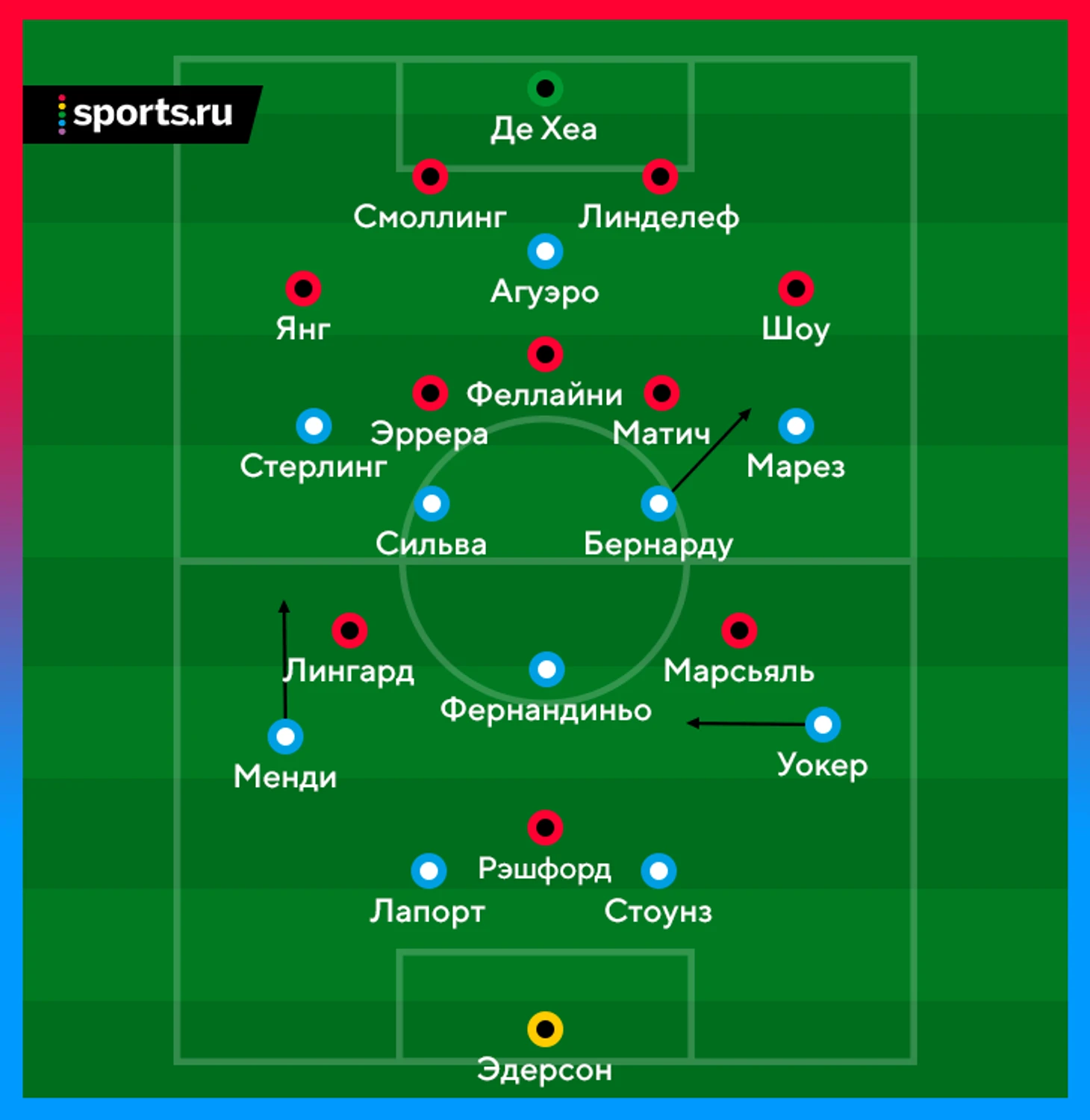 У «Сити» все предсказуемо – не хватает лишь травмированного Кевина де Брюйне. Сочетание Рахим Стерлинг-Рияд Марез на флангах становится классикой для больших матчей. С «Ливерпулем» и «Арсеналом» практически эти же игроки располагались по схеме 4-2-3-1 – в тех играх Пеп Гвардиола страховался, но дома против «Юнайтед» сыграл по типичному смелому варианту 4-3-3.