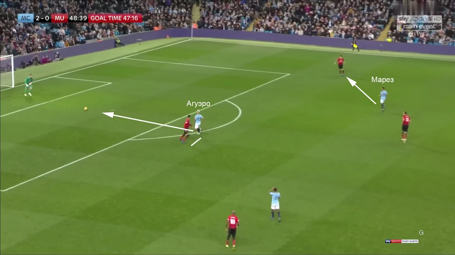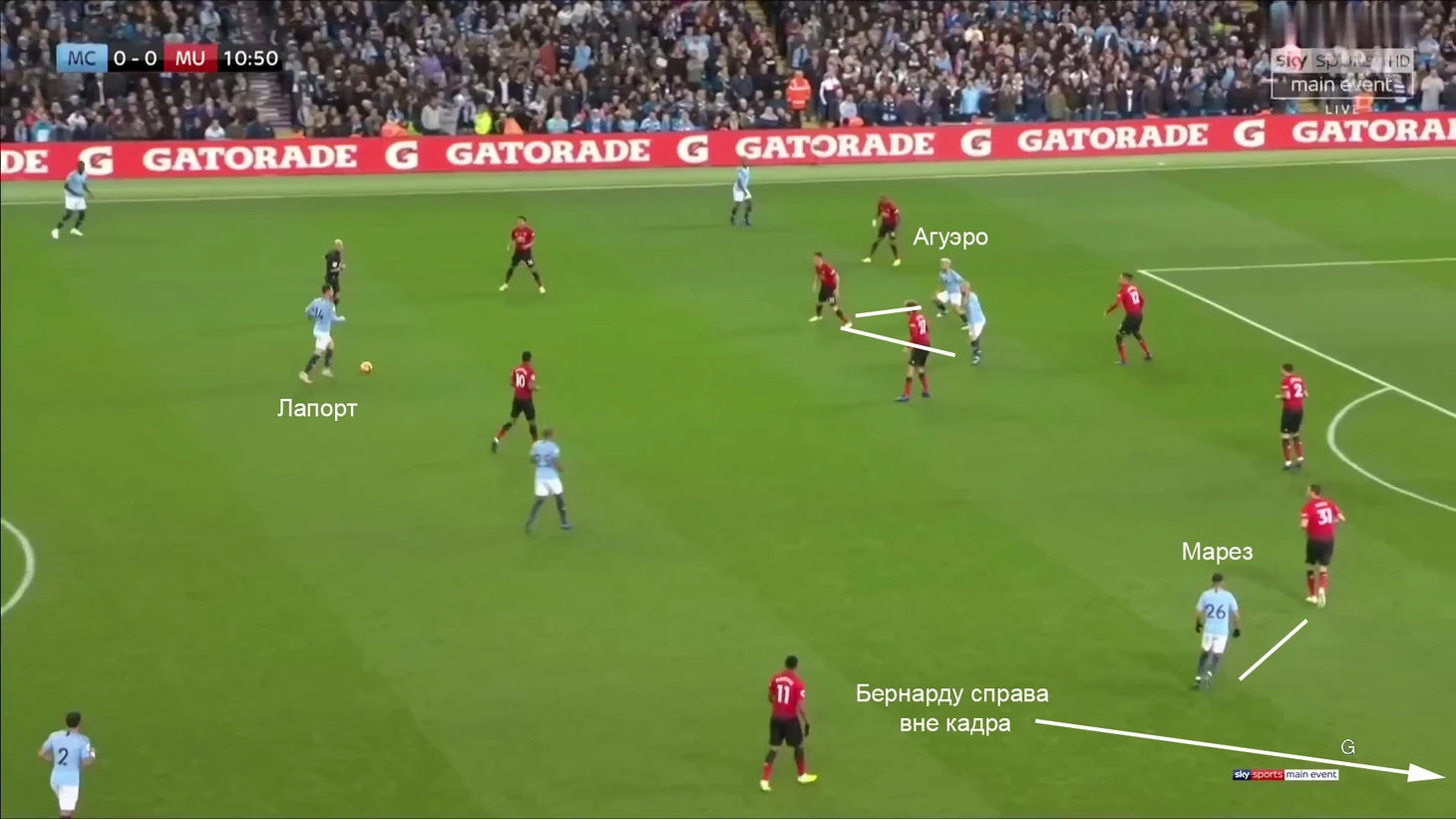 Во-вторых, Серхио Агуэро опускался в опорную зону и перегружал полузащитников «МЮ». Оказывался в зоне, где Матич или Эррера играют персонально и вынуждал их разрываться. В-третьих, Бернарду часто менялся позициями с Марезом (иногда на продолжительные отрезки) – это дополнительные моменты с передачей, где всегда есть риск ошибок. В-четвертых, пользуясь увлеченностью полузащитников «МЮ» персоналками, Лапорт часто продвигался вперед с мячом – если его не прессингуют, он способен напрямую обострить; если прессингуют, то возникает пространство в опорной зоне.
