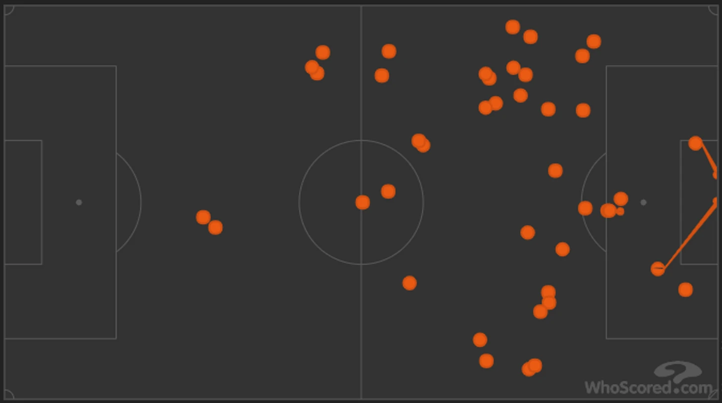 Карта касаний МЮ во втором тайме. Почти ничего в центральной зоне.