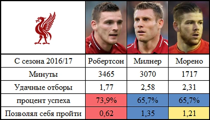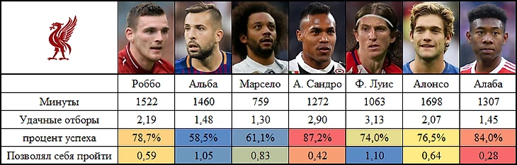 Каждого из них проходили в два раза чаще, чем Энди. Если сравнить со звездами из предыдущей таблицы, то Джеймс и Альберто будут худшими по данному показателю. Появление Робертсона в команде безусловно положительно сказалось на качестве обороны.