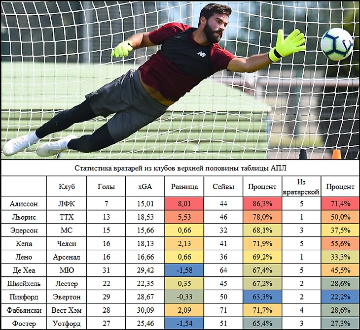 Бразилец сразу же начал оправдывать потраченную на него сумму. Статистически он превосходит любого вратаря АПЛ. 86,3% — это просто сумасшедший процент сейвов, в прошлом сезоне лучшими в Европе по данному показателю были Облак (82,7%) и Де Хеа (80,3%), а сам Алиссон имел 80,1%. Из 7 ударов, нанесенных из вратарской, Бекер отразил 5.