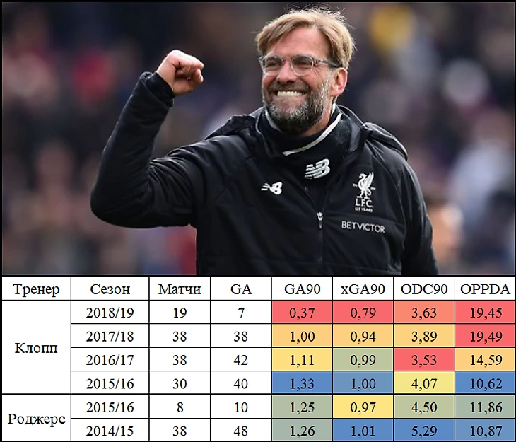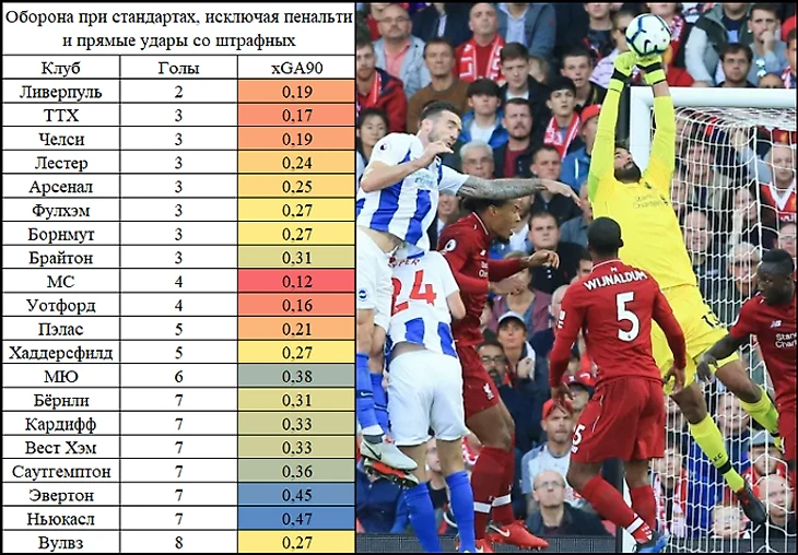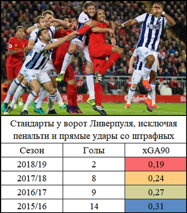В первом сезоне Клоппа «Ливерпуль» пропустил 14 мячей после навесов со штрафных и угловых. Дальше количество пропущенных голов и допущенных хG только падало. На данный момент «красные» пропустили со стандартов всего 2 мяча, один из которых засчитан ошибочно (игрок «Бернли» находился в офсайде). Это лучший показатель в лиге: