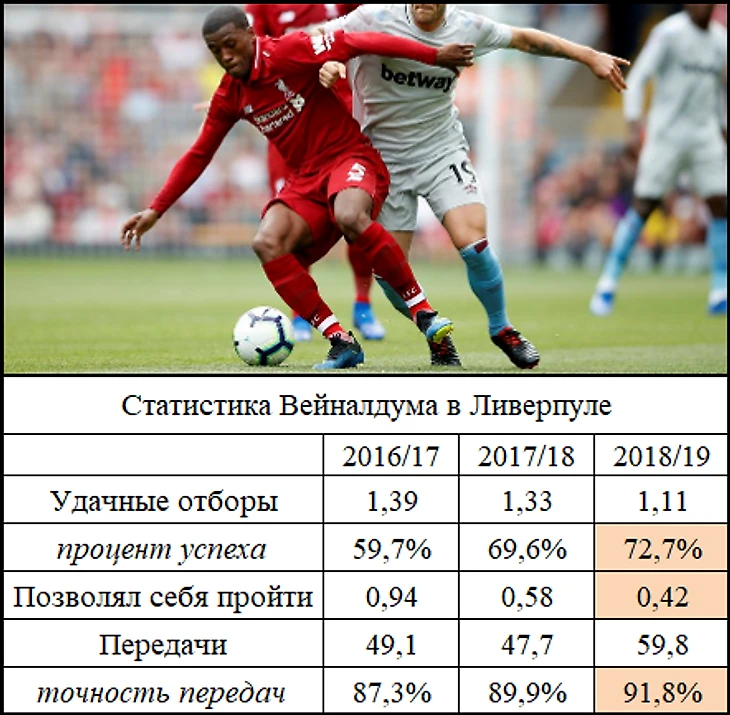 Если раньше Клопп использовал голландца в роли одной из восьмерок в 4-3-3, то в этом сезоне наиболее распространенной схемой стала 4-2-3-1, где Вейналдум занимает позицию одного из опорников. Джини здорово адаптировался к новой роли, почти не ошибается в передачах (четвертая точность в лиге после Ковачича и двух центральных защитников «Сити»), а соперники проходят его реже, чем других опорников из клубов топ-6: