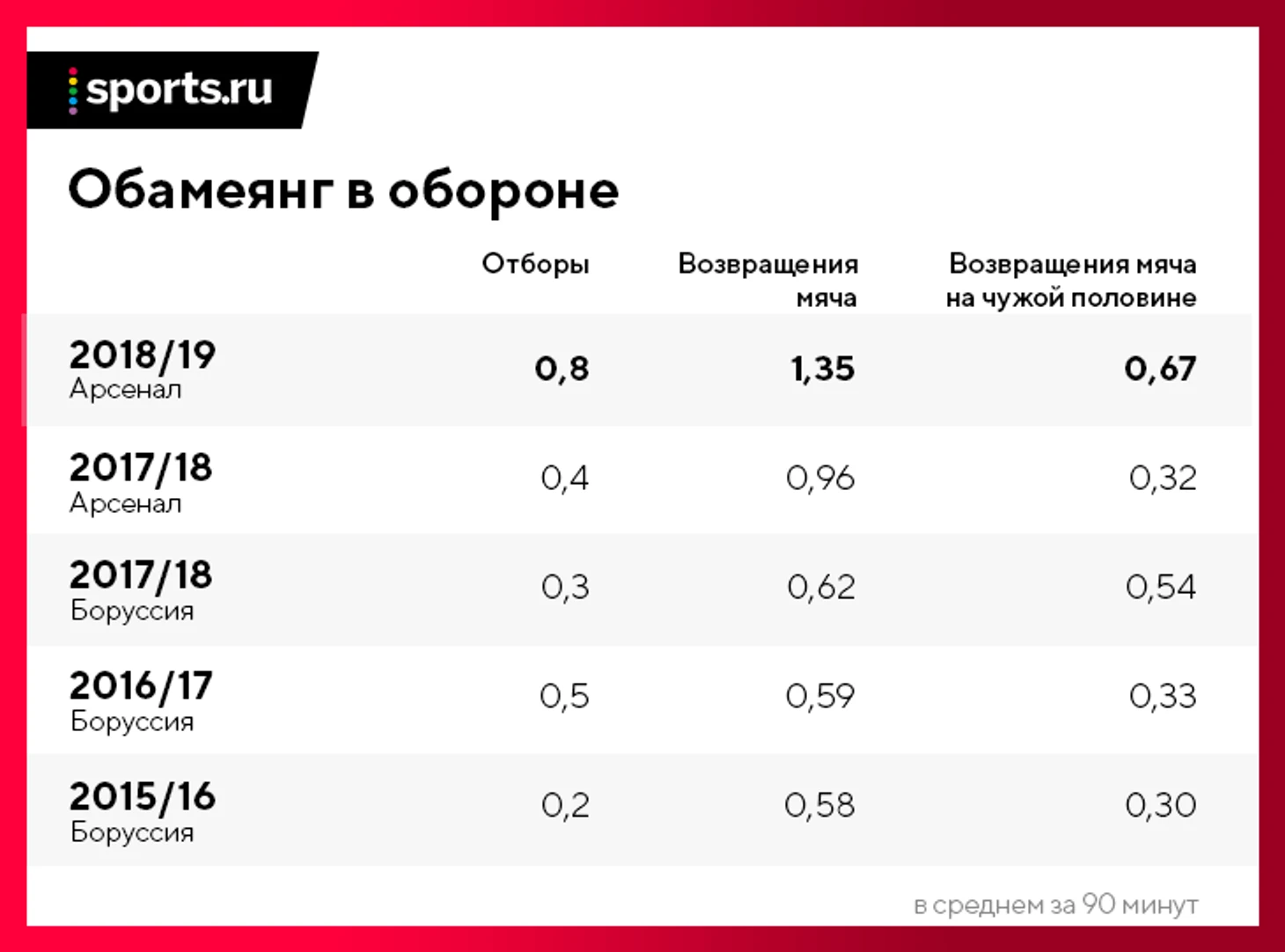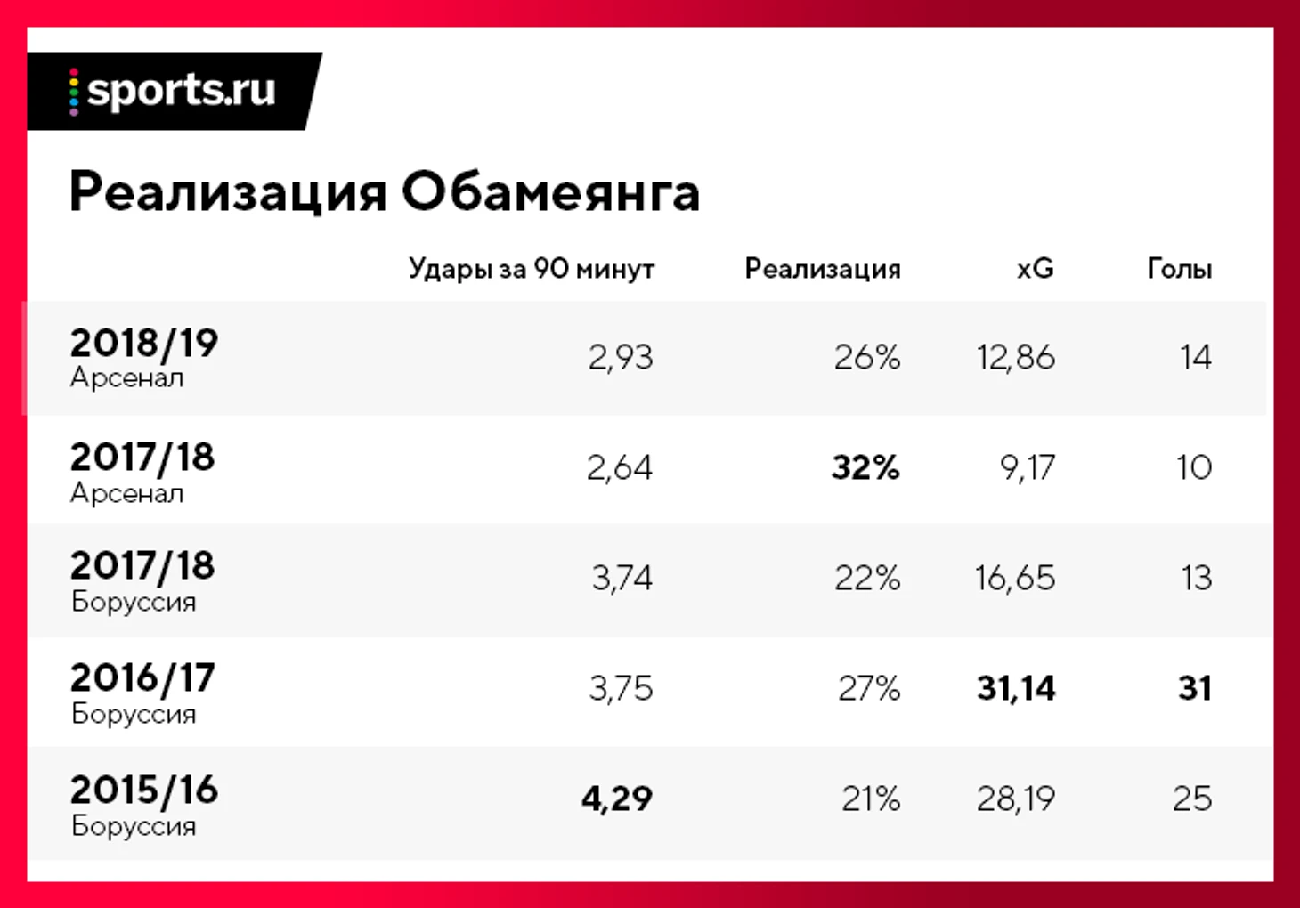 Даже в самый результативный сезон-2016/17 Обамеянг забил чуть меньше ожидаемого уровня. В Германии габонец постоянно забивал ниже ожидаемого уровня. Он был уникален в плане открываний, поэтому получал шикарные моменты, но топ-игрок должен был выжимать из этих моментов больше (хотя бы в отдельные сезоны).